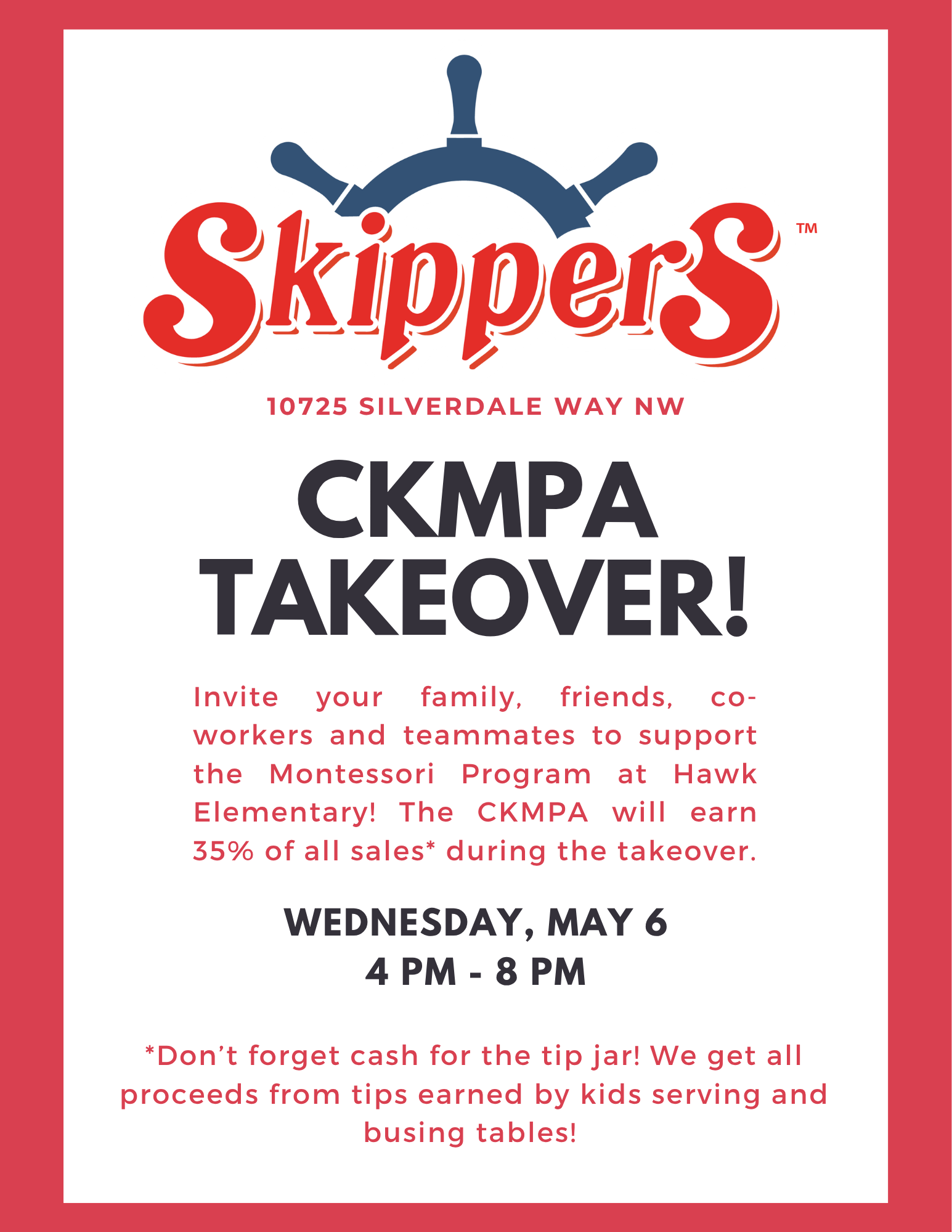 Bring the whole family to the Silverdale Skippers Seafood & Chowder House on Wednesday, May 6th to support our Montessori Program! The CKMPA will receive 35% of all sales between 4:00 and 8:00 p.m. and we keep all the money in the tip jars! Dine in and meet up with other Montessori families, or swing by for an easy takeout. Students and their families will be helping out at the restaurant by bringing out orders, bussing tables and waving signs to bring in the customers. Don't forget to tell your friends and coworkers!
