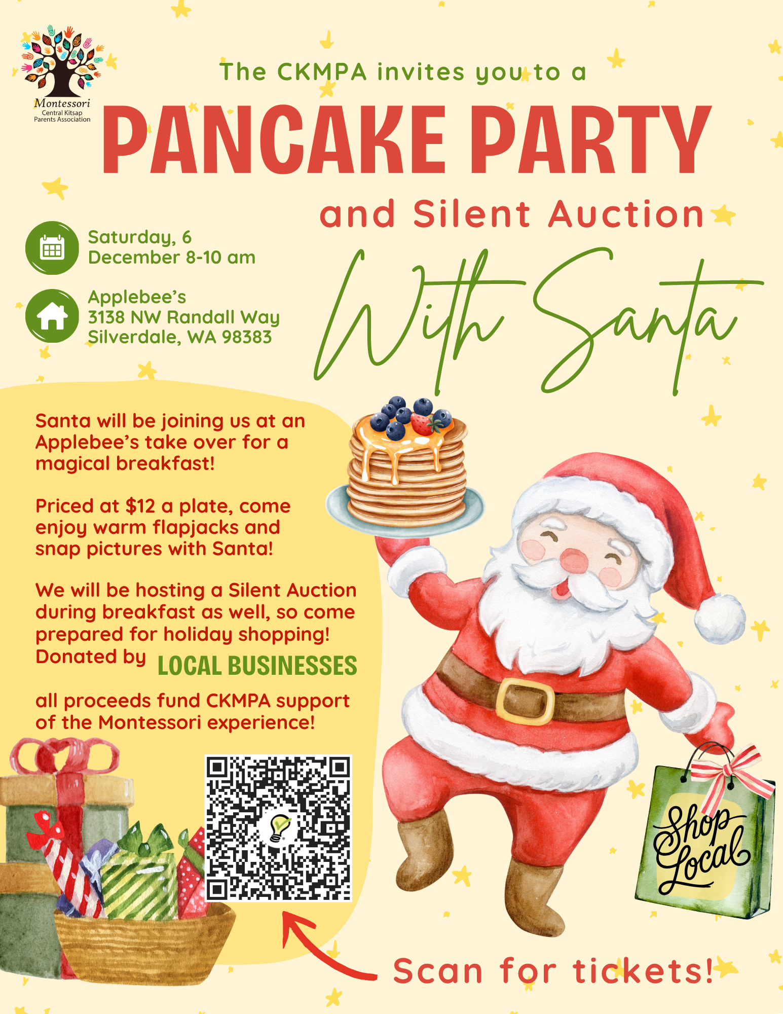 Mark your calendars! Please save the date for our Pancake Party and Silent Auction with Santa on Saturday, December 6, from 8 to 10 a.m. at Applebee’s in Silverdale. Tickets can be purchased here or scan the QR code on the flier below.