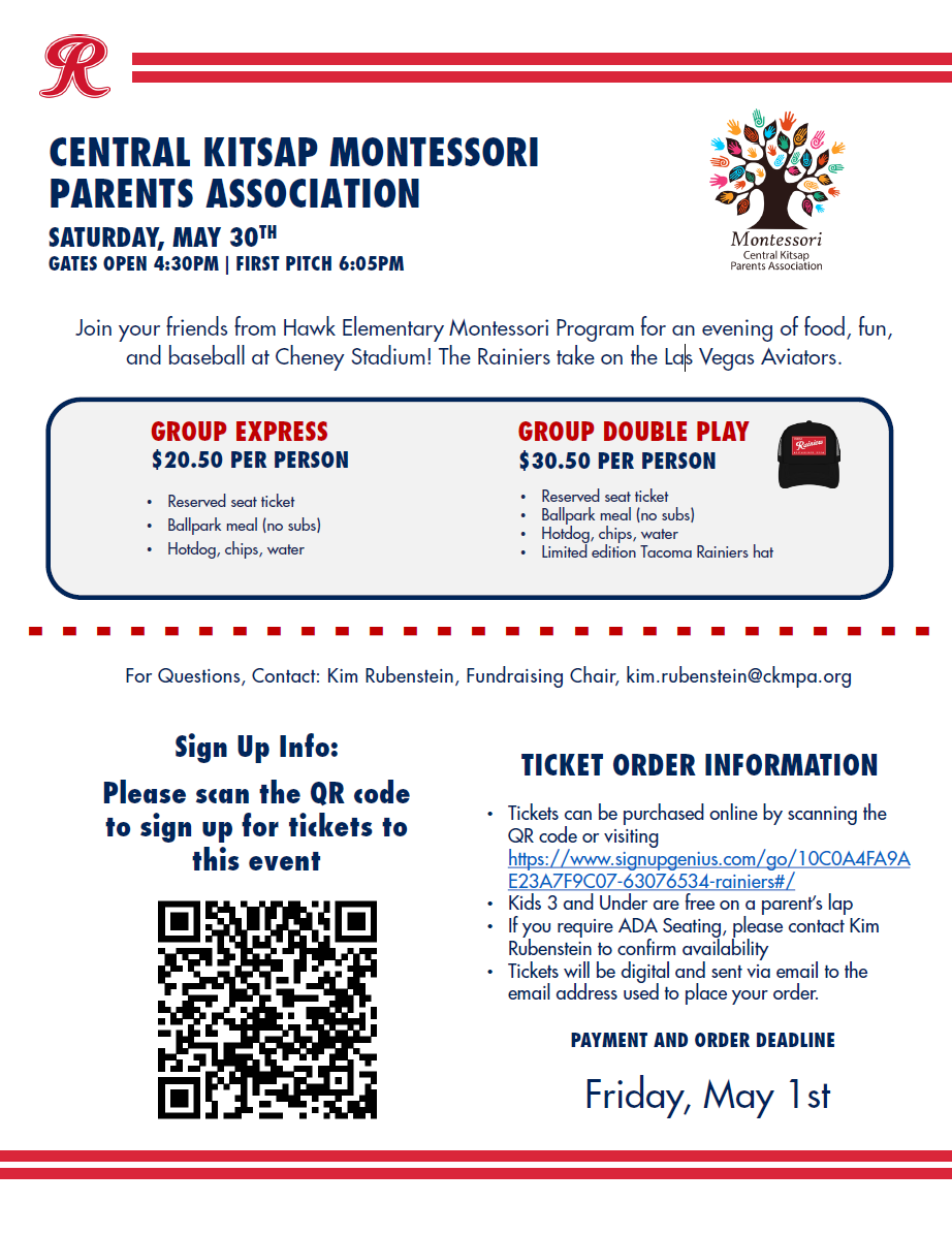On Saturday, May 30th, the Tacoma Rainiers will have a special section at Cheney Stadium for our Montessori community (and you can bring your friends and family to celebrate with us, too)! The ticket price includes a ballpark meal (the higher-priced ticket includes a limited-edition Rainiers hat!).
